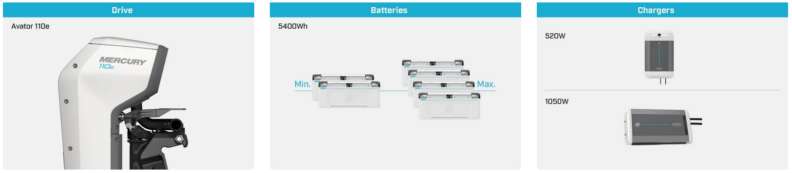 Přenosná nabíječka Avator™ 520 W dokáže dobít dvě vybitá baterie 5400 Wh přibližně za 20 hodin. Integrovaná nabíječka na lodi s výkonem 1 kW dokáže dobu nabíjení zkrátit o více než 50 %.