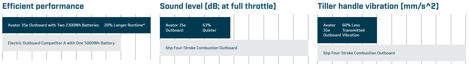 Model Avator 20e dokáže zrychlit loď Lund® WC-12 o délce 12 stop podobně jako čtyřtaktní závěsný motor 5 hp, zatímco zrychlení modelu 35e je srovnatelné s čtyřtaktním motorem 9,9 hp.