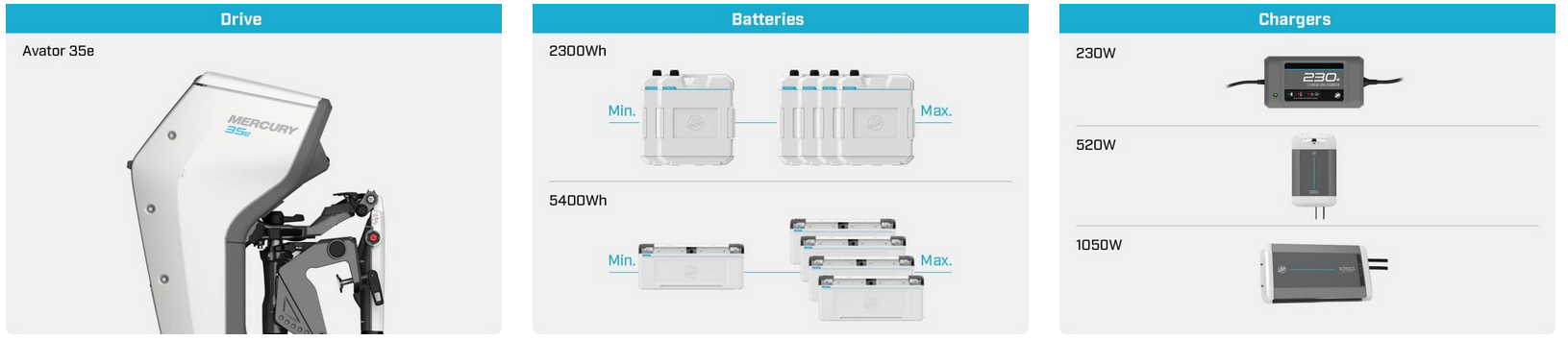Autorizovaný prodejce Mercury vám pomůže vybavit vaši loď kapacitou baterií, kterou potřebujete. Můžete se rozhodnout připojit přímo jednu baterii 2300 Wh pro maximální jednoduchost a přenositelnost, nebo si prodloužit dojezd a dobu provozu přidáním Avator Power Center a připojením až čtyř baterií.