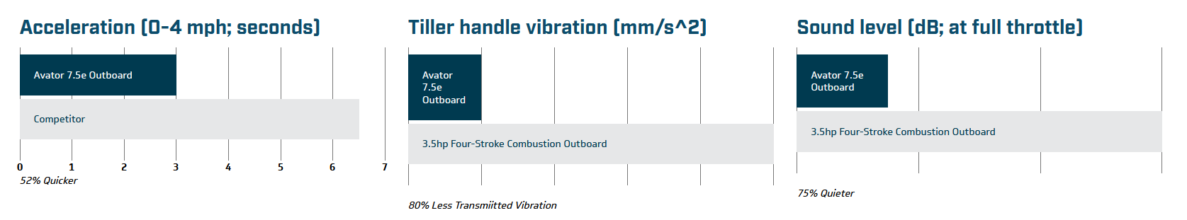Na základě testů s lodí Veer™ V13 o délce 13 stop (suchá hmotnost 173 kg) dokáže elektrický přívěsný motor Avator 7.5e při plně nabité baterii 1 kWh běžet 60 minut nebo urazit 5 mil při konstantním plném plynu, a až 19 hodin nebo 34 mil při konstantním 25% plynu. Skutečný dojezd a doba provozu se mohou lišit – výkon ovlivňují podmínky prostředí, typ a zatížení lodi.